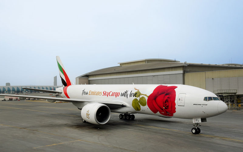 كشفت "الإمارات للشحن الجوي" النقاب عن ملصق ضخم لوردة على إحدى طائرات الشحن التابعة لها من طراز بوينج 777F قبل يوم واحد من احتفالات عيد الحب.