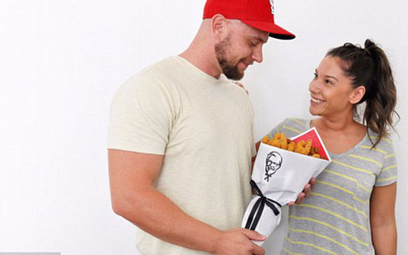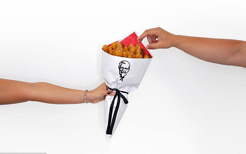 طرحت سلسلة مطاعم KFC فكرة جديدة بمناسبة عيد الحب (الفالنتاين) مكونة من باقة من الدجاج بدلا من الورد على اعتبارها الهدية المثالية للراغبين بالخروج عن المألوف في هذه المناسبة وذلك وفقاً لما جاء في صحيفة الديلي ميل.