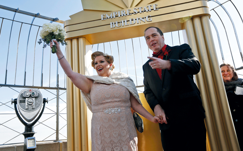 في تحدٍّ واضح للرياح الباردة العاتية فوق مدينة نيويورك، تبادل 14 زوجاً، أول من أمس، وعود وعهود زواجهم في يوم «عيد الحب» أعلى مبنى امباير ستيت بمدينة نيويورك الأميركية.