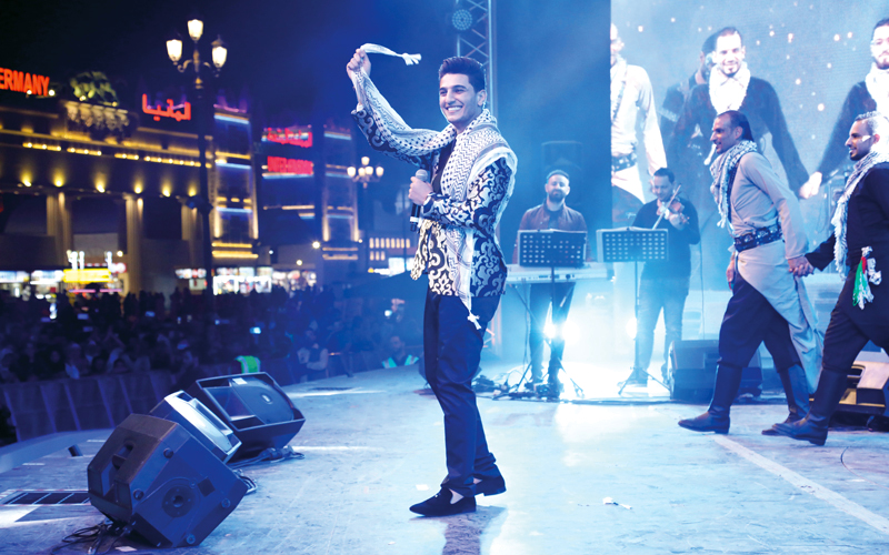 قدم الفنان الفلسطيني محمد عسّاف، باقة من أجمل أغانيه، خلال حفله الغنائي الذي أحياه على المسرح الثقافي الرئيس في القرية العالمية بدبي، يوم الجمعة الماضي.