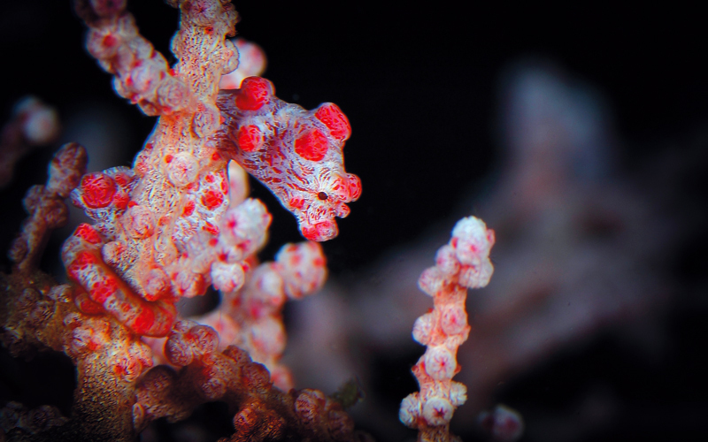 يعيش حصان البحر الصغير على مراوح البحر، وقد اكتشف للمرة الأولى حين كانت مراوح البحر تُجمع لوضعها في حوض زينة، ومن الصعب رؤيته لأن جسمه مغطى بدرنات تماثل بوالب مضيفة. يتعلق حصان البحر بالبوالب بإحكام بواسطة ذيله القابل للتراجع، ويمد جسمه إلى الماء ليمتص العوالق الحيوانية المائية داخل فمه، ويتألف جسمه من صفائح عظمية ورأس مثبت على الجسم كما لو كان حصاناً مشدوداً بلجام. صورة لحصان البحر الصغير وهو يحاول الاختباء. الصورة من منطقة راجا إمبات الإندونيسية.