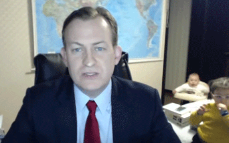 اقتحم طفل المحلل السياسي روبيرت كيلي، البالغ من العمر 3 سنوات، غرفة أبيه حيث كان يجري حوارا مباشرا مع قناة "بي بي سي" البريطانية، ليبادر المذيع ويقول للضيف إن ابنه على الهواء، فما كان من المحلل إلا أن اعتذر، مرجعاً يده إلى الوراء، محاولاً افهام طفله بضرورة الخروج، وما هي إلا لحظات حتى اقتحم طفله الآخر، وأمه تهرول وراءه لتجر الطفلين إلى خارج الغرفة.