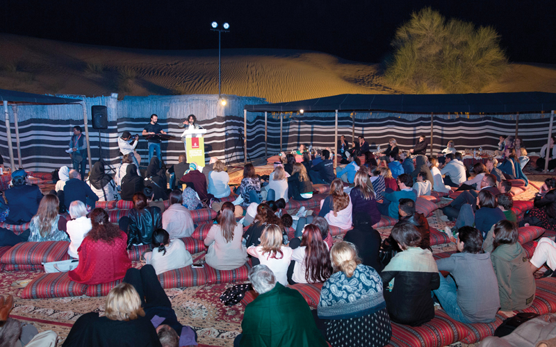 وأكد خادم أنه روعي في اختيار الفعاليات التي استوعبتها الدورة، الطابع البانورامي الثقافي العالمي والمحلي، بحيث يتحول المهرجان إلى مساحة جذب لمختلف الشرائح وذوي الميول الثقافية والأدبية المختلفة، لافتاً إلى أن الشباب وطلبة المدارس والجامعات، كان لهم نصيب كبير من اهتمام المهرجان في هذه الدورة. وفي التفصيل، استضاف منتجع المها الصحراوي، مساء أول من أمس، الأمسية السنوية التي تحولت إلى أحد ثوابت ومعالم المهرجان الرئيسة، وهي أمسية «أبيات من أعماق الصحراء»، التي تقام بالتعاون مع هيئة دبي للثقافة والفنون.