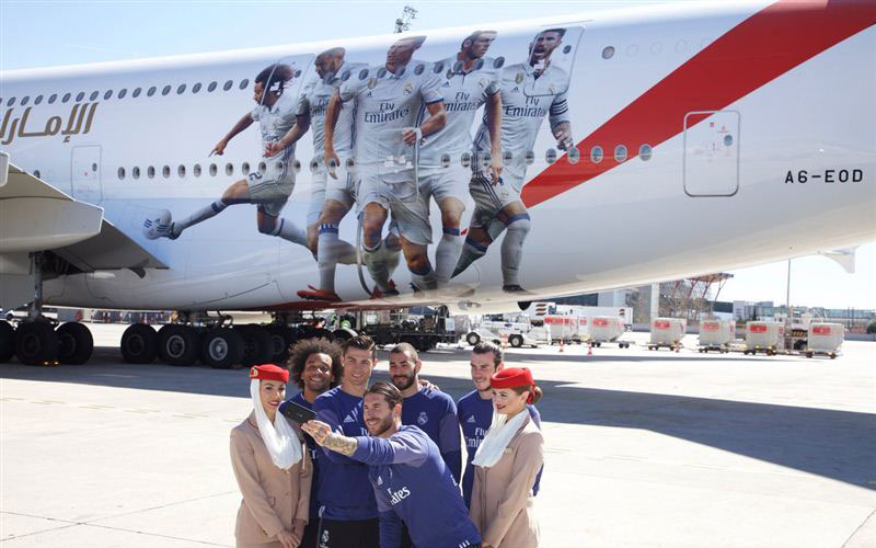 كشفت طيران الإمارات النقاب أمس عن ملصق جديد لعدد من نجوم فريق ريال مدريد الإسباني الذي ترعاه الناقلة على إحدى طائراتها العملاقة الإيرباص A380.