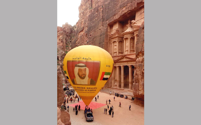 حلّق منطاد الإمارات، أول من أمس، في سماء مدينة البتراء، بمحافظة معان جنوب الأردن، والتي تشتهر بعمارتها المنحوتة بالصخور، ونظام القنوات المائية القديمة.