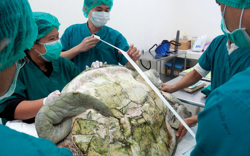 وخضعت السلحفاة «الحصالة» لعملية استغرقت سبع ساعات لاستخراج عملات بلغ وزنها نحو خمسة كيلوغرامات ابتلعتها خطأ، ظناً منها أنها طعام.