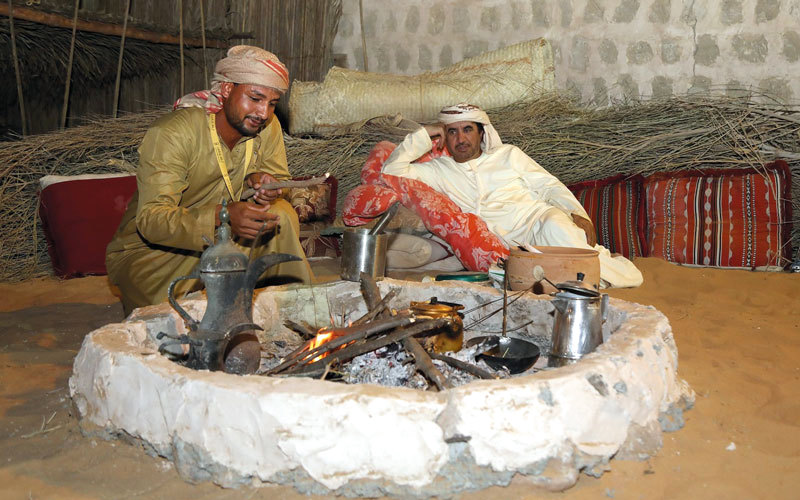 البيئة البدوية التي جهزها سالم آل علي من أم القيوين، ويقيم فيها كما هي حاله في كل عام منذ نحو 10 سنوات، يشرح للزوار والضيوف مختلف تفاصيل البيئة البدوية، ويقول: «نريد أن نُعرّف الزوار وأبناءنا عن مختلف تفاصيل حياتنا في البيئة البدوية، ونريد لهم أن يتعلموا الكثير، وأن يتمسكوا بتراثهم، حيث نحرص على الحفاظ عليه ونقله إلى الجيل الجديد، وهي حاضرة دوماً في الأيام، وتجد عشاقاً كثراً من الزوار ومن الجيل الجديد، وتقدم صورة شاملة عن حياة الإماراتيين في مراحل سابقة».