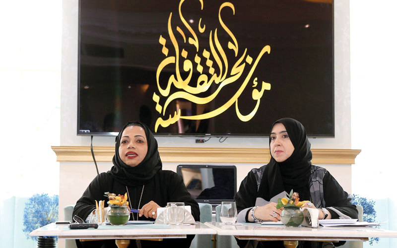 عائشة سلطان وعايدة الأزدي خلال مؤتمر الكشف عن فعاليات «بحر الثقافة». تصوير: إريك أرازاس