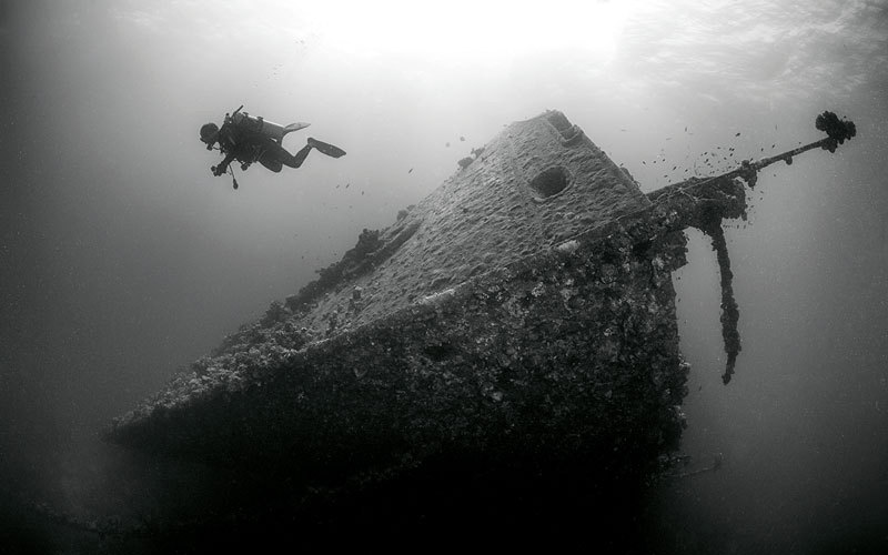 حطام السفينة تحول إلى موطن للعديد من أنواع الكائنات البحرية، التي اتخذت منها أعشاشاً ومصائد، إلى جانب الأنواع المتعددة من الحياة البحرية، التي تزخر بها المياه السطحية وقاع البحر العميق، مع وجود مياه بلورية صافية وانعكاسات متعددة الألوان من الشعاب المرجانية، التي تفتن الهواة وذوي الخبرة من المصورين للمشاهد التي تحت مياه البحر.. صورة من مقدمة السفينة.