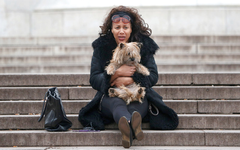 امرأة تجلس مع كلبها أمام نصب الملكة فكتوريا التذكاري المقابل لقصر بيكنغهام بالعاصمة البريطانية لندن.