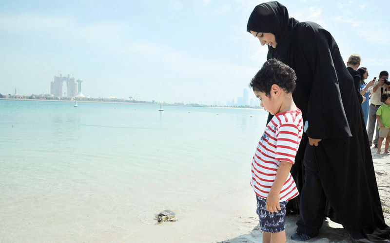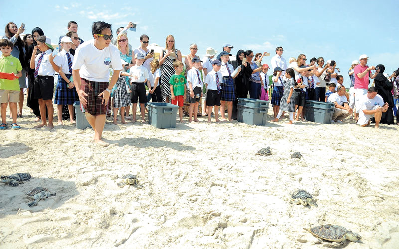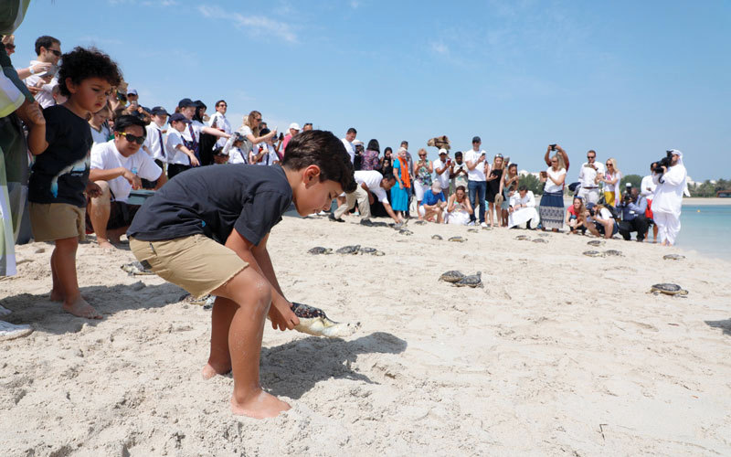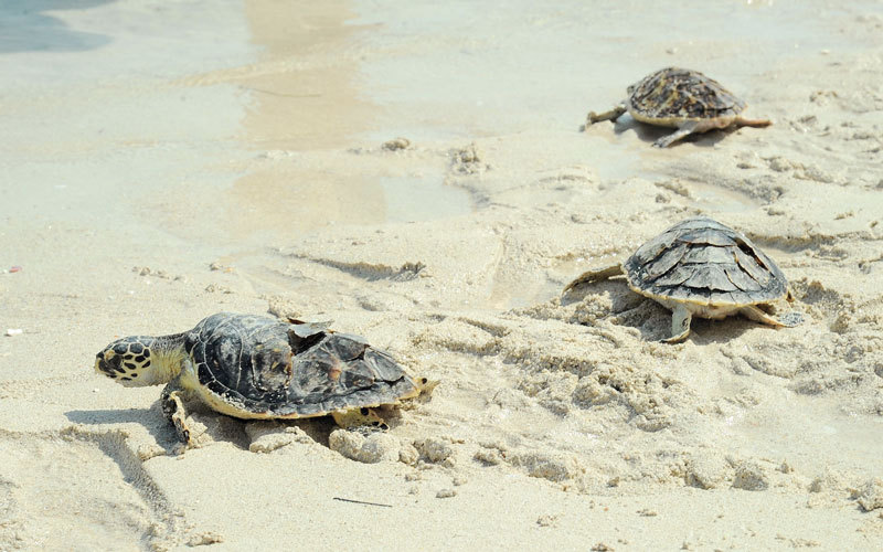 أطلقت هيئة البيئة - أبوظبي، بالتعاون مع مشروع إعادة تأهيل السلاحف بدبي اليوم، 49 سلحفاة من سلاحف منقار الصقر المهددة بالانقراض، وسلحفاة واحدة من السلاحف ضخمة الرأس على شاطئ «قصر الإمارات» في أبوظبي.