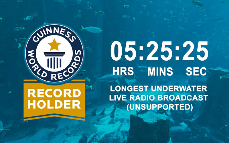 من جديد، تسجل دبي اسمها في موسوعة «غينيس» للأرقام القياسية.. هذه المرة من تحت الماء، وعبر بوابة منتجع أتلانتس النخلة، إذ تم تحطيم الرقم القياسي العالمي لأطول بث إذاعي مباشر تحت الماء في العالم الأسبوع الماضي.