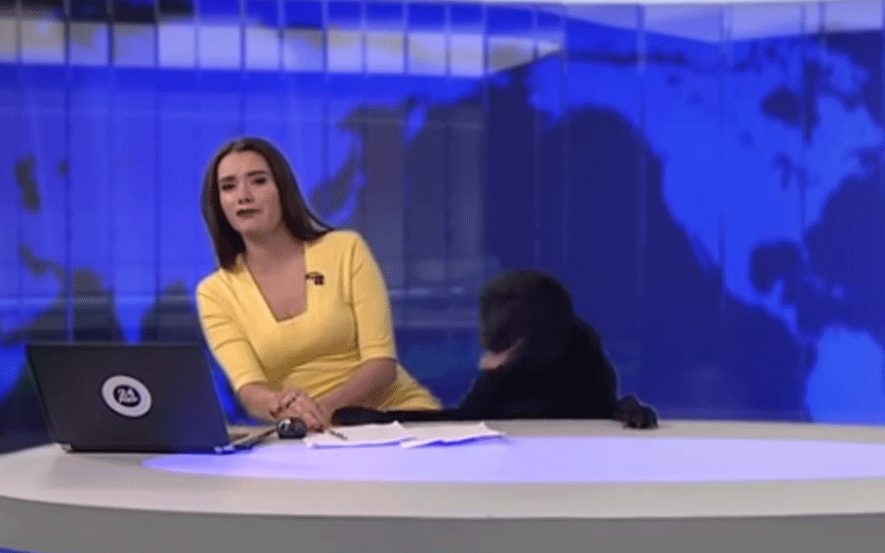 فاجأ كلب مذيعة أثناء قراءتها نشرة الأخبار في استوديو إحدى القنوات الروسية، ونجح في تحويل مسار النشرة إلى لحظات من الرعب والجد واللعب.