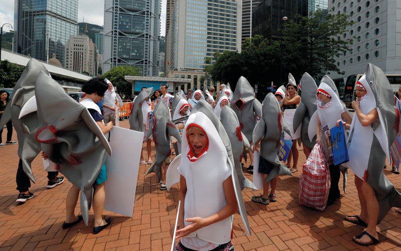 طوق محتجون، يرتدون أزياء على شكل أسماك قرش بلا زعانف، مطعماً شهيراً بجوار ميناء هونغ كونغ، لمطالبته بالكف عن بيع زعانف أسماك القرش، لاسيما الأنواع المعرضة لخطر الانقراض، مثل القرش الأبيض. وهتف المتظاهرون ولوحوا بلافتات لدى اقترابهم من مطعم ماكسيمس بالاس، المملوك جزئياً لوحدة تابعة لشركة غاردين ماثيسون غروب، وكان مليئاً بأناس يأكلون الطعام الصيني، لكن الشرطة منعت دخولهم.
