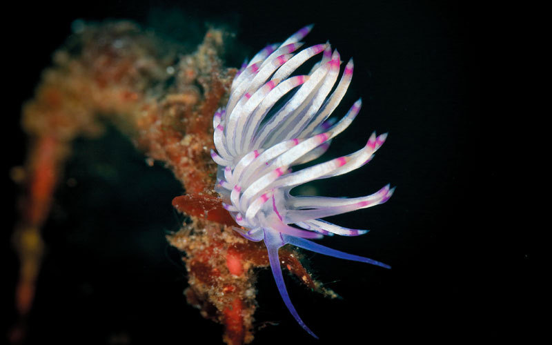 صورة لمخلوق من فصيلة عارية الخياشيم، تمكنت من تصويره خلال غطسة ليلية في منطقة تولمبين الإندونيسية، لا يتجاوز حجم الواحد منه العشرة ملليمترات.
