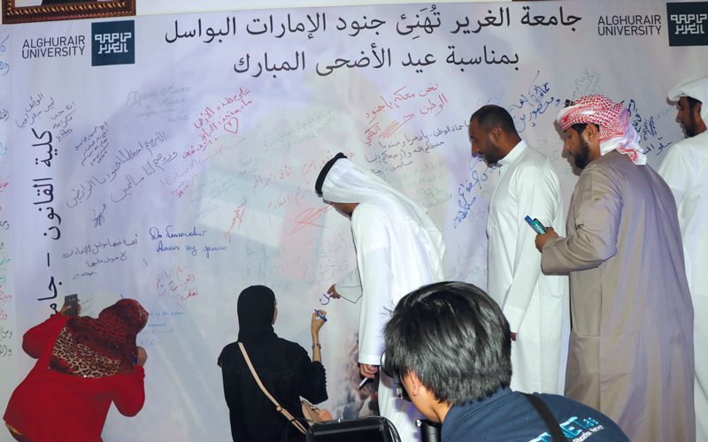 أهدت كلية القانون في جامعة الغرير، جدارية تمثل بطاقة معايدة لجنود الإمارات البواسل، بمناسبة اقتراب عيد الأضحى المبارك.