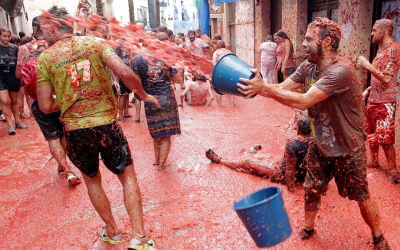شارك أكثر من 20 ألف شخص بمهرجان «حرب الطماطم» السنوي في إسبانيا، إذ تبادلوا، أمس، التراشق باستخدام 160 طناً من الطماطم (البندورة) التي أوشكت على العطب.