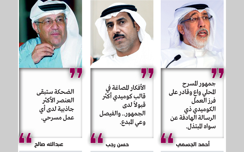 ويضيف الجسمي: «لحسن الحظ أن جمهور خشباتنا المحلية والخليجية يتميز بوعي شديد، وقدرة هائلة على فرز الغث من الثمين، وفي ظل بحثه عن الضحكة والكوميديا الراقية، لا يمكن أن ينخدع بإسفاف أو ابتذال غير مقبولين».