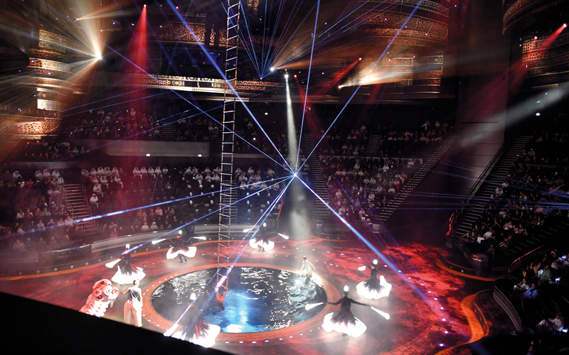 كما تضمن العرض فقرات ثقافية وفنية، وأكروبات رياضية وبهلوانية أبهرت المشاهدين، وحبست الأنفاس، لما تتمتع به من حرفية عالية ولياقة بدنية وتقنية احترافية تناغمت والتقنية العالية التي صُمم عليها المسرح الدائم «الحبتور سيتي».
