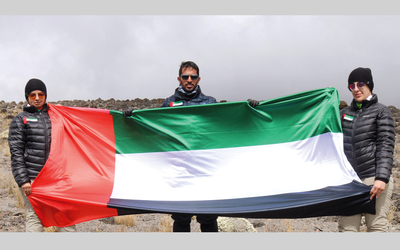 وتعبيراً عن حبهم وانتمائهم لوطنهم، رفع كل من رئيسة التوطين والعلاقات الحكومية في قسم الموارد البشرية مريم آل علي، ومديرة توظيف - قسم التوطين، رقية الزرعوني، ومسؤول الامتثال في مجموعة التدقيق والتحقيق والمراقبة، محمد المرزوقي، العلم على قمة جبل كلمينغارو الذي يبلغ ارتفاعه 5895 متراً.