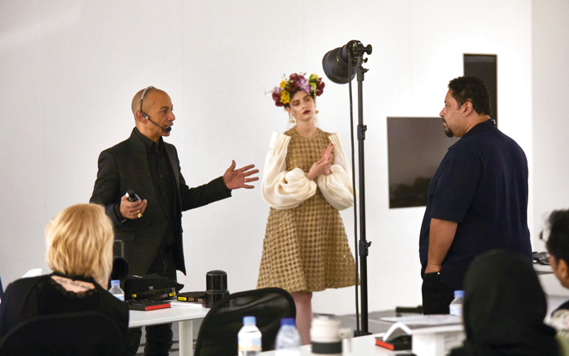 المصور البريطاني كولين هاوكينز، خلال ورشة عمل حملت عنوان «تصوير المنتجات» حوّل القاعة إلى استوديو ضخم خصص أركانه لتكون بمثابة المنصات المتباينة الإضاءة والألوان ليلتقط صوراً مختلفة لمنتج واحد.