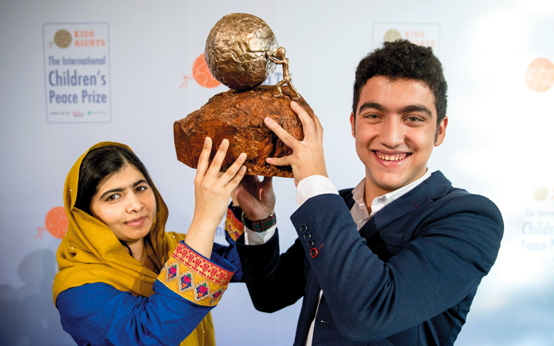 ملالا يوسفزاي تسلم الجائزة لمحمّد الجندي. من المصدر