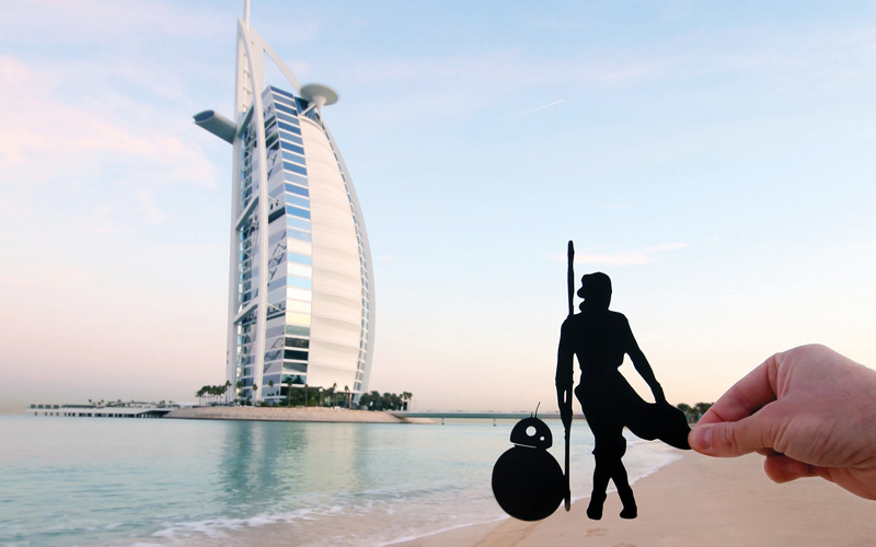 أضفى الفنان ريتش ماك كور، نكهة أحدث فيلم في سلسلة «حرب النجوم» Star Wars على اثنين من أبرز معالم دبي؛ برج خليفة وبرج العرب.