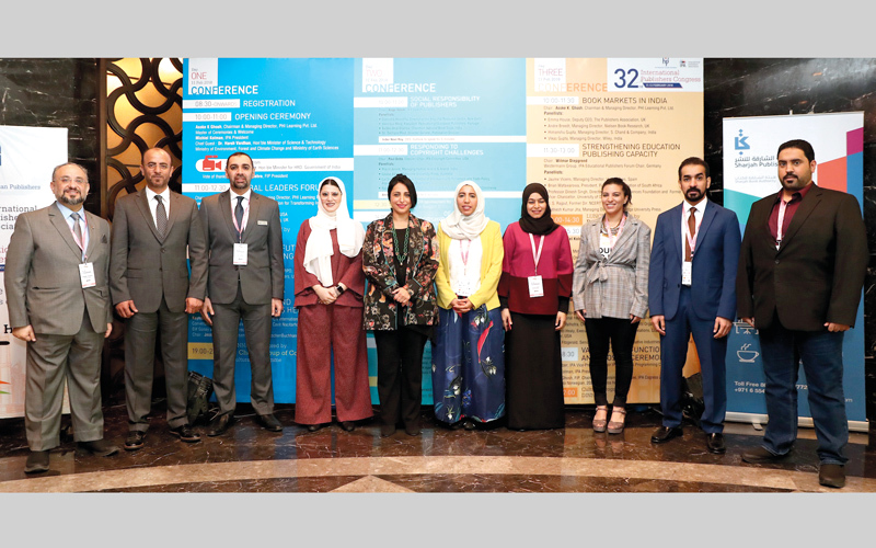 بدور القاسمي تتوسط الناشرين الإماراتيين المشاركين في المؤتمر الدولي. من المصدر