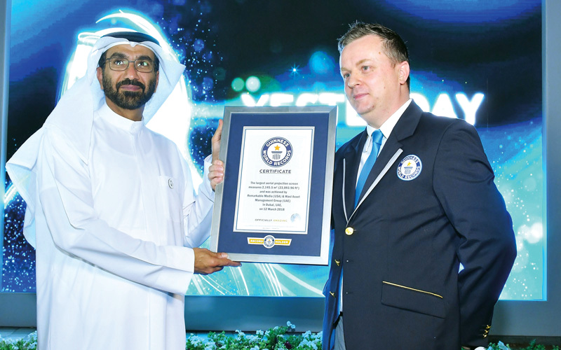وتابع الحدث جمهور كبير في دبي، إضافة إلى ممثلين من «غينيس»، لتوثيق الإنجاز، المتحقق بشاشة جوية طولها 42.15 متراً، وعرضها 92.49 متراً، حلّقت في سماء دبي، بوساطة مروحيتين من طراز «بيل 212»، حملت إحداهما اللوحة، بينما عرضت الأخرى فيديو على الشاشة، باستخدام مزيج من تقنية الواقع الافتراضي والعرض المباشر، لبثّ فيلم قصير عن «عام زايد»، ليتابع الجمهور عملاً يبرز المآثر والقيم التي رافقت حياة الوالد المؤسّس.