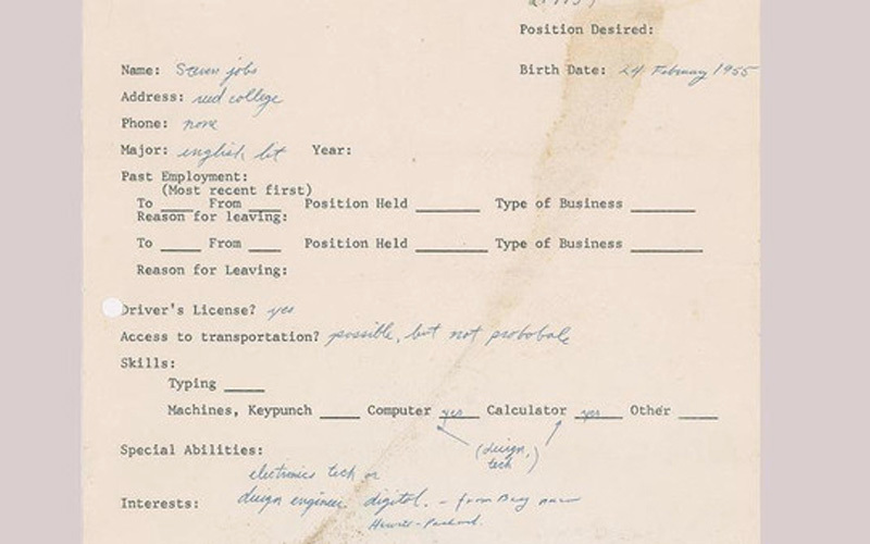 وكتب في خانة الاسم، ستيف جوبز، وفي خانة العنوان، كلية ريد، وهي كلية في أوريجون درس فيها جوبز لفترة قصيرة. وبجانب «الهاتف» كتب: «لا شيء». وكتب جوبز في خانة «القدرات الخاصة»: مهندس فني أو مصمم برمجيات.
