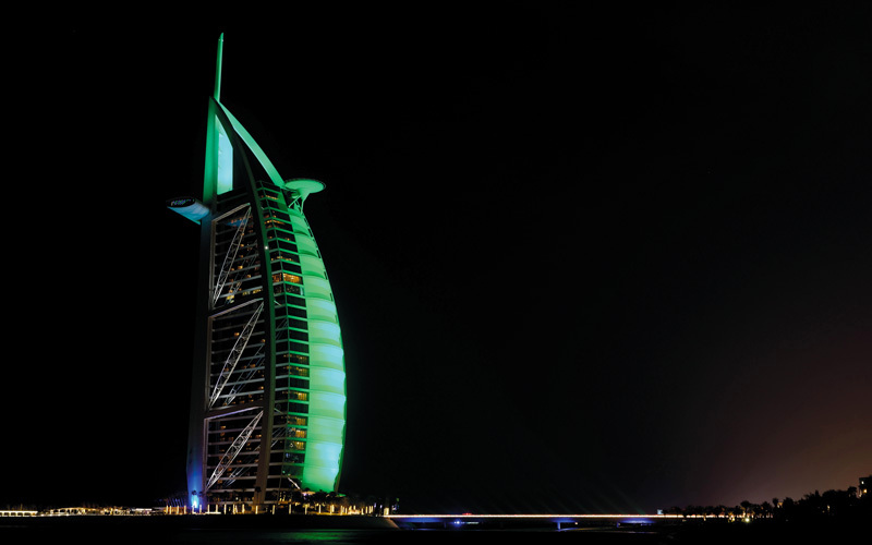 وتزين برج العرب وفندق ياس فيسوري واستاد سوق دبي الحرة للتنس ونادي خور دبي للغولف واليخوت، باللون الأخضر، ضمن قائمة المعالم الشهيرة التي شملت 300 معلم وصرح ومتحف وبرج حول العالم، بما فيها دار أوبرا سيدني وعين لندن والكولوسيوم في روما.