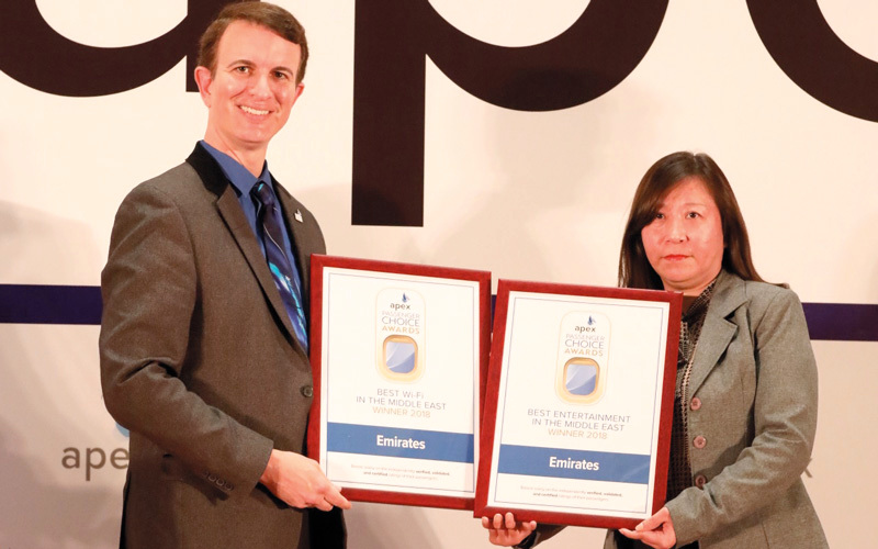 «طيران الإمارات» تسلّمت الجوائز خلال حفل جوائز «أبيكس آسيا» 2018 في مدينة شنغهاي. من المصدر