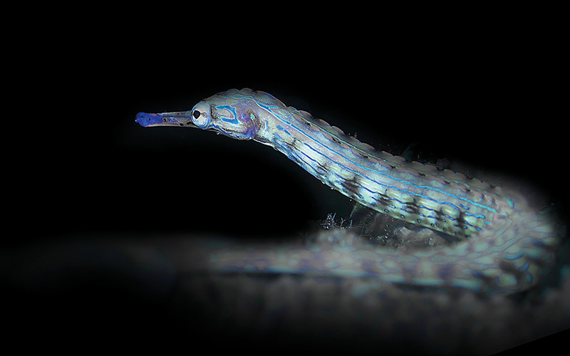 كثير من متلقي الصور البحرية، تبهرهم الألوان والأشكال، التي هي أقرب ما تكون إلى الرسوم المتحركة، أو لخيال الفنانين التشكيليين، لنعتبر بقدرة خالق هذه المخلوقات، وبمجرد أن ندرك أن كل هذه الاكتشافات والصور لا تصل إلى ١٠%، بحسب قول العلماء، من الذي تم اكتشافه في البحار والمحيطات.. فلك أن تتخيل أيها القارئ ما يمكن أن نجده ونستكشفه، من خلال نسبة الـ٩٠% المتبقية في هذه البحار.. صورة للسمكة الأنبوبية من منطقة منادو في إندونيسيا.