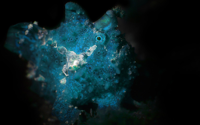 الألوان في المخلوقات البحرية لها رسائل بيئية وتحذيرية للمخلوقات البحرية الأخرى، ومن هذه الرسائل الألوان التي تمثل دعوة للتزاوج واستمالة الطرف الآخر في التكاثر، أما الرسائل التحذيرية فغالباً تكون ألوانها فاقعة، وتشير في المخلوقات البحرية إلى السموم التي تحملها تلك المخلوقات، كما أن الألوان، والتمويه، تمنحها الفرصة لأفضل اقتراب للصيد. صورة لسمكة الضفدع وهي في حالة ترقب للصيد، وقد استخدمت التمويه في أفضل حالاته. من منطقة لمبي في إندونيسيا.