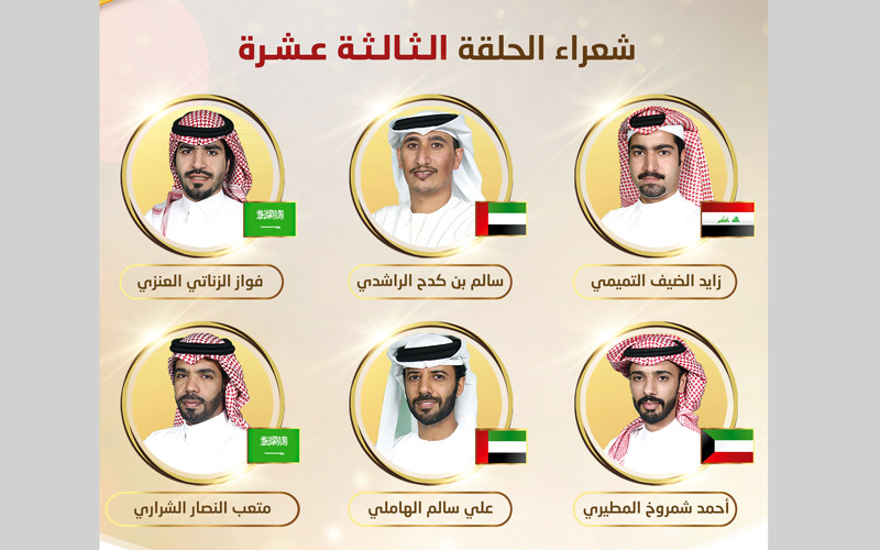 ويلتقي في هذه الحلقة ستة شعراء، هم: أحمد بن شمروخ المطيري من الكويت، وزايد الضيف التميمي من العراق، وسالم بن كدح الراشدي وعلي سالم الهاملي من الإمارات، وفواز الزناتي العنزي ومتعب النصار الشراري من السعودية، الذين سيقدمون روائعهم الشعرية أمام أعضاء لجنة التحكيم، المؤلفة من الدكتور غسان الحسن، وحمد السعيد، وسلطان العميمي.