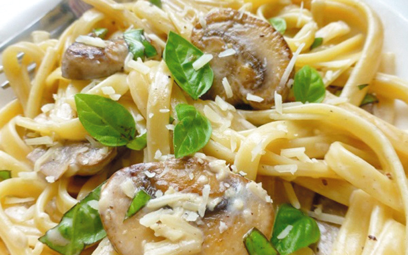 في قدر كبير يوضع القليل من الماء المغلي والمملح، وتضاف المعكرونة (الاسباجيتي) حتى تنضج، وبعد نحو تسع دقائق تصفى المعكرونة، وتضاف إلى خليط الفطر والبقدونس والفلفل.