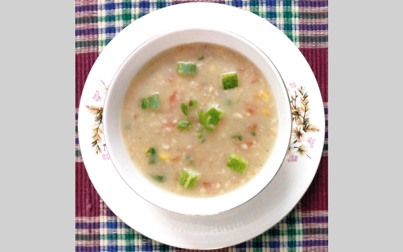 ينقّع الشوفان بماء دافئ، ويهرس الثوم والبصل والفلفل والطماطم، ثم يبشر الجزر،