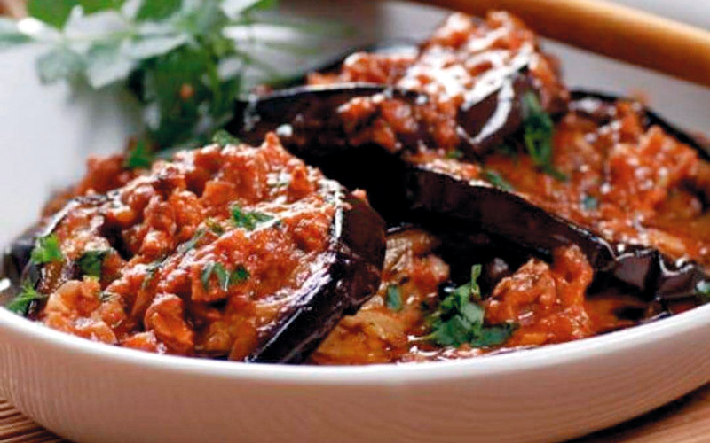 يقطّع الباذنجان الى مكعبات، وتُشوى المكعبات من كل الجوانب، ثم تُوضع جانباً. ثم يُحمى زيت الزيتون في قدر متوسط الحجم ويُقلى البصل المقطع الى شرائح لمدة ثلاث دقائق. يُضاف الثوم ويحرك حتى تفوح رائحته، ثم تضاف الطماطم وتحرك لمدة خمس دقائق أو حتى تصبح طرية. يضاف معجون الطماطم، والماء والباذنجان المحضر، يترَك المزيج على النارحتى 15 دقيقة. يضاف مسحوق القرفة والنعناع المجفف ويُطهى المزيج على نار خفيفة لمدة 10 دقائق .