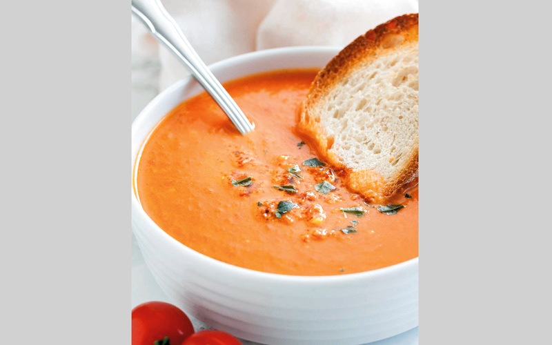 يسخّن زيت الزيتون على نار متوسطة، ثم يضاف إليه البصل ويقلب لثلاث دقائق، ويضاف الثوم ويقلب لدقيقة واحدة، ويضاف بعدها الريحان والطماطم. يوضع الخليط في الخلاط الكهربائي، ويضرب المزيج للحصول على قوام أملس. يوضع الحليب على النار ويقلّب مع الملح والفلفل، ويترك على النار ساخناً لمدة دقيقتين، ويضاف إليه المزيج. يوضع رذاذ الزيت في صينية ويقلب الخبز ويحمّص، وبعد ذلك يفرك الخبز بالثوم، ويستخدم مع الشوربة.