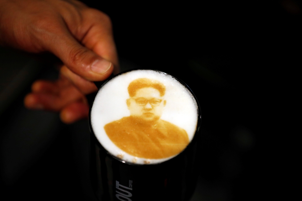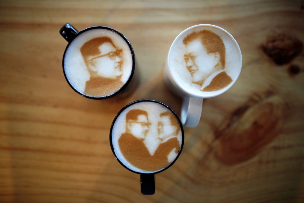 فمنذ أن عقد كيم قمة في أبريل الماضي بوجه بشوش مع الرئيس الكوري الجنوبي مون-جيه إن، يقدم مقهى (إن آند أوت) في مدينة جونجو، التي تبعد ثلاث ساعات من العاصمة سول، قهوة لاتيه تزين رغوتها صور الزعيمين.
