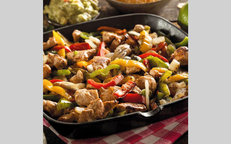 نضع شرائح الدجاج والبصل والفليفلة الحمراء والفليفلة الصفراء والذرة والفطر في وعاء، ثم نضيف الزيت على خليط الدجاج والخضار، ثم نضيف الملح والفلفل الأسود والفلفل الأحمر والقرفة والفلفل الأبيض والكزبرة. نحرك حتى تتجانس المكونات، ثم يترك المزيج في الثلاجة لمدة ثلاث ساعات. نضع مزيج الدجاج والخضار في مقلاة على حرارة متوسّطة. نقلب المزيج من وقت إلى آخر حتى ينضج الدجاج.