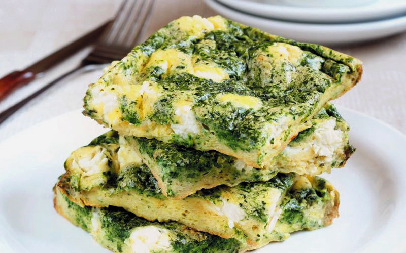 يسخّن الفرن ليصل إلى 180 درجة مئوية، وتسخّن ملعقتان كبيرتان من زيت الزيتون في وعاء متوسط الحجم على حرارة متوسطة. يضاف كلٌّ من البصل والسبانخ ويحرّك لأربع دقائق تقريباً. يضاف الملح والفلفل ثم يرفع المزيج عن النار. يخفق البيض مع ملعقتين كبيرتين من فتات الخبز والملح في وعاء كبير. ويضاف خليط البيض وجبنة الفيتا إلى الوعاء المناسب للفرن، وتحرّك المكونات. ترش الملعقتان المتبقيتان من فتات الخبز على الخليط. توضع المقلاة في الفرن وتخبز المكونات لنحو 15 دقيقة.