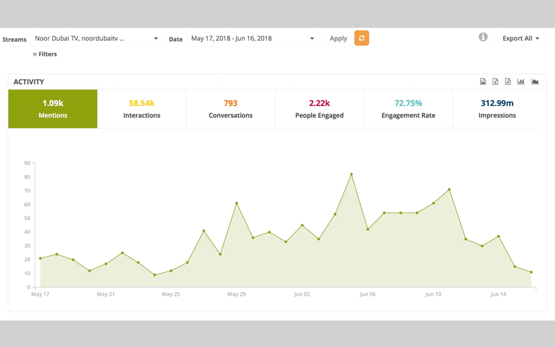 وحققت برامج ومسلسلات قناة نور دبي التلفزيونية خلال شهر رمضان 2018، 1100 تغريدة ومنشور (Mentions) عبر منصات التواصل الاجتماعي المختلفة، التي بدورها حصدت تفاعلاً بلغ 58 ألفاً (Interactions)