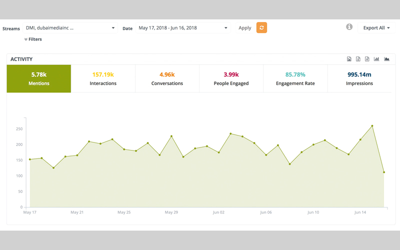 وأشارت نتائج الإحصاءات والمتابعات الرقمية على حسابات المؤسسة عبر وسائل التواصل الاجتماعي ومنصة «آوان»، إلى تحقيق برامج ومسلسلات تلفزيون دبي خلال شهر رمضان المبارك 2018، ما يزيد على 8360 تغريدة ومنشوراً (Mentions) عبر منصات التواصل الاجتماعي المختلفة، التي بدورها حصدت تفاعلاً بلغ 1.15 مليون (Interactions)، في الوقت الذي حقق وسم (#معاً_في_رمضان) 1200 (Mentions)، و(230 k) (Interactions)، وما يزيد على 437 مليون (impressions).