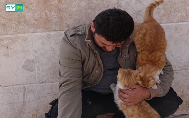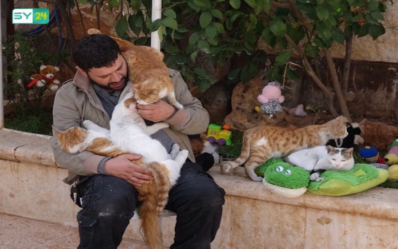 وقال "بداية فكرة بيت القطط كانت من أصدقائي. طبعا أنا كنت أطعم القطط بالشوارع بعدة مناطق، فطلبوا مني بشدة القصف والاشتباكات، طلبوا مني اني أجمع القطط الموجودة في الأحياء اللي كنت أطعمها أجمعهن ببيت ويكون تأسيس أول بيت للقطط في سوريا ويمكن بالوطن العربي رح يكون هاد أول بيت. طبعا أسسنا أول بيت بحلب وانقصف. اضطرينا نطلع ع الريف وأسسنا ثاني بيت للقطط، وبجانبه مركز رعاية بيطرية لجميع أنواع القطط". وتعرضت مدينة حلب لمعارك شرسة على مدى سنوات إضافة إلى حصار قاس لعدة أشهر وعمليات قصف إلى أن انتهت مقاومة مسلحي المعارضة بها في 2016. وقبل الحرب كانت حلب أكبر محافظات سورية من حيث عدد السكان، وأغناها من حيث الناتج الزراعي والصناعي.