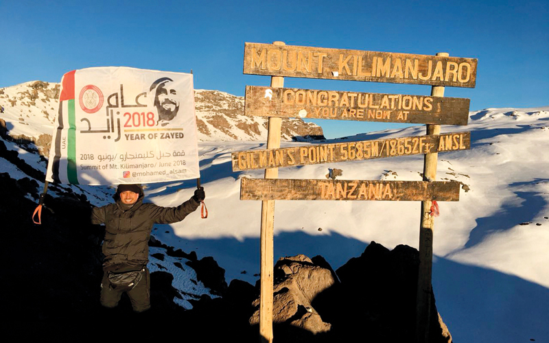 تسلق المقدم محمد النقبي، من قطاع الأمن الجنائي في شرطة أبوظبي، أعلى قمة جبلية في إفريقيا «جبل كليمنجارو» بتنزانيا، على ارتفاع 5895 متراً عن سطح الأرض، التي تعد خامس أطول قمة في العالم، وذلك خلال فترة زمنية استغرقت أسبوعاً، وعقب صعوده القمة قام برفع صورة للمغفور له الشيخ زايد بن سلطان آل نهيان، طيب الله ثراه، وشعار عام زايد 2018.