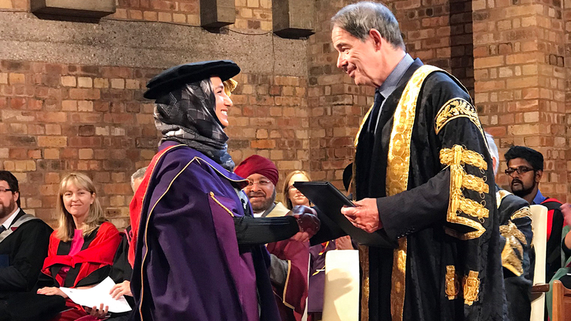 منح مجلس أمناء جامعة كيل البريطانية، الدكتورة نوال الحوسني، المندوب الدائم لدولة الإمارات العربية المتحدة لدى الوكالة الدولية للطاقة المتجددة «آيرينا»، نائب مدير عام أكاديمية الإمارات الدبلوماسية، درجة الدكتوراه الفخرية تقديراً لإسهامها البارز وتفانيها في دعم قطاع الطاقة المتجددة والاستدامة.