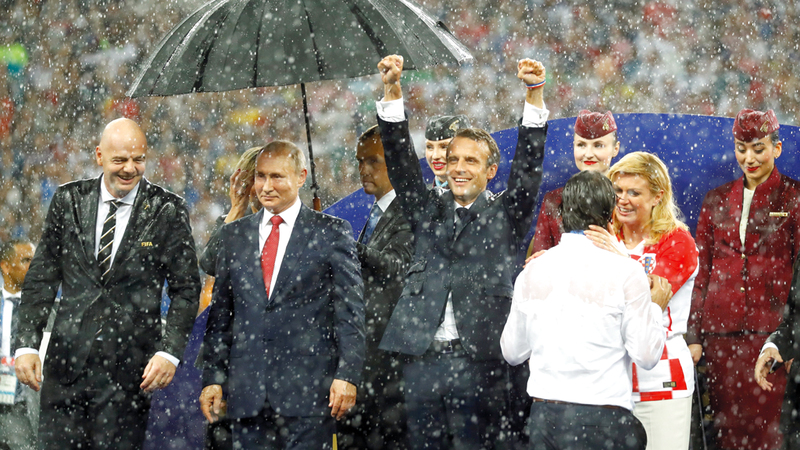 تعرض الرئيس الروسي، فلاديمير بوتين، لموجة من السخرية من قبل الألمان على موقع شبكة التواصل الاجتماعي «تويتر»، إثر حرصه على الوقوف تحت مظلة خلال تساقط الأمطار عقب المباراة النهائية لبطولة كأس العالم 2018 لكرة القدم، التي اختتمت في روسيا مساء أول من أمس. وتزايد هطول الأمطار بشكل كبير خلال مراسم تسليم الميداليات والتتويج، عقب نهاية المباراة بفوز المنتخب الفرنسي على نظيره الكرواتي 4/2، وقد بدا بوتين حريصاً على الالتزام بالوقوف في مكانه تحت مظلة تقيه مياه الأمطار. وفي الوقت نفسه كان الرئيس الفرنسي، إيمانويل ماكرون، والرئيسة الكرواتية، كوليندا جرابار- كيتاروفيتش، يقفان بجواره، وقد تعرضا لمياه الأمطار بشكل كثيف. وكتب أحد مستخدمي «تويتر»: «في ما يتعلق بالمظلات، شعار روسيا هو: بوتين أولاً»، وكتب آخر «بوتين فقط هو المصنوع من السكر». وكتب مستخدم آخر «صورة ختامية محرجة في نهائي كأس العالم. بوتين يتمتع بالحماية، مع ترك الآخرين يقفون تحت الأمطار».