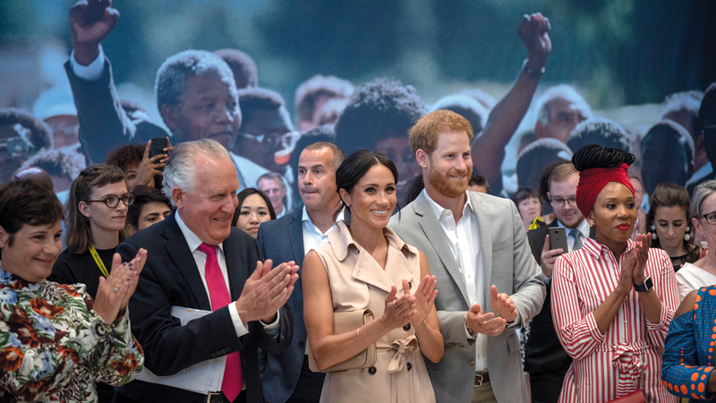 زار الأمير هاري وزوجته ميغان، أمس، معرضاً أقيم بمناسبة مرور 100 عام على ميلاد الزعيم ورئيس جنوب إفريقيا الراحل، نيلسون مانديلا. والتقى دوق ودوقة ساسكس مع أصدقاء وأسرة الزعيم، الذي حارب التمييز العنصري في بلده، وتوفي في عام 2013، ومنهم حفيدته زاماسوازي دلاميني - مانديلا.