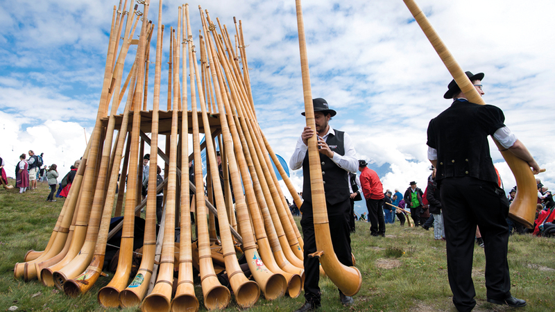 صدحت الأصوات الناعمة لمئات الأبواق الخشبية التقليدية الشهيرة في سويسرا، وتردد صداها في أنحاء الوادي الممتد على سفح جبل تراكويت، أمس، في ختام أكبر مهرجان من نوعه في العالم.